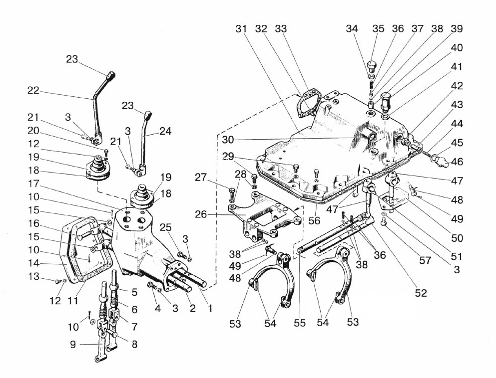 1 - Вал 80С-1702070; 2 - Вал 80С-1702060; 3 - Шайба ШП10; 4 - Болт М10х35; 5 - Сфера 142-1702032; 6 - Пружина 77-37-117; 7 - Вилка 80С-1702074; 8 - Палец 12х32; 9 - Рычаг 80С-1702073; 10 - Шплинт 3,2х18; 11 - Прокладка 80-1702068; 12 - Шайба ШП6; 13 - Винт М6х16; 14 - Крышка 80-1702067; 15 - Шайба ШЧ12; 16 - Палец 12х55; 17 - Корпус 80-1702078; 18 - Чехол 55-47-569-А; 19 - Шайба 80С-1702075; 20 - Винт М6х20; 21 - Болт М10х30; 22 - Рычаг 1522-1702600; 23 - Рукоятка 12-12-108; 24 - Рычаг 1522-1702500; 25 - Болт М10х40; 26 - Корпус 80С-1702081; 27 - Болт М12х30; 28 - Шайба ШП12; 29 - Болт призонный М12х42 50-1702092; 30 - Заглушка 28-005; 31 - Крышка 1221-1702025; 32 - Штифт 8х16; 33 - Прокладка 80С-1702066; 34 - Гайка М16; 35 - Болт 70-1703204; 36 - Пружина фиксатора 50-1702148-А; 37 - Направляющая 80-1704039; 38 - Шарик ГОСТ 3722-81 10,0-60; 39 - Втулка 70-1703013; 40 - Сапун 85-1702270; 41 - Прокладка В50-3522023; 42 - Втулка 80С-1702301; 43 - Фиксатор 80С-1702303; 44 - Пружина 80-1737113; 45 - Шайба 80-1702098; 46 - Корпус 80С-1702302; 47 - Рычаг 85-1702055; 48 - Болт 80-1702108; 49 - Проволока 1,6-0-С; 50 - Кулиса 75-1702052; 51 - Заклепка 6х10; 52 - Поводок 80С-1702083; 53 - Вилка 80С-1702091Б; 54 - Сухарь 80С-1702092; 55 - Поводок 80С-1702082; 56 - Прокладка 85-1702026; 57 - Болт М10х20